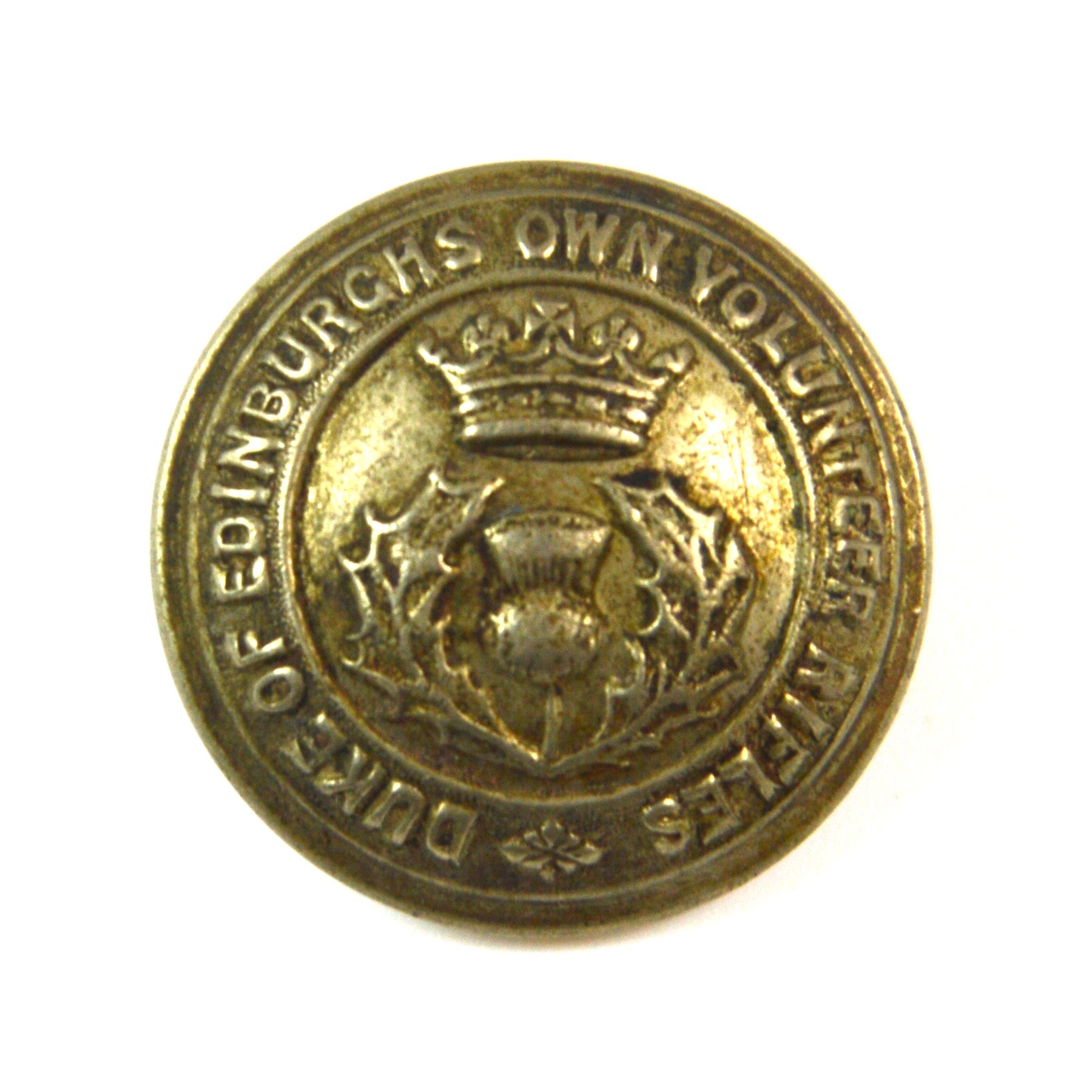 South African Duke of Edinburgh’s Own Volunteer Rifles uniform button, 25mm size, executed in white metal and associated with this historic colonial volunteer regiment. This button features the regiment’s recognised device in clear relief, incorporating a crowned thistle emblem with the surrounding title “Duke of Edinburgh’s Own Volunteer Rifles”, all set within a lined border and produced in a white metal finish characteristic of officer or dress uniform fittings.