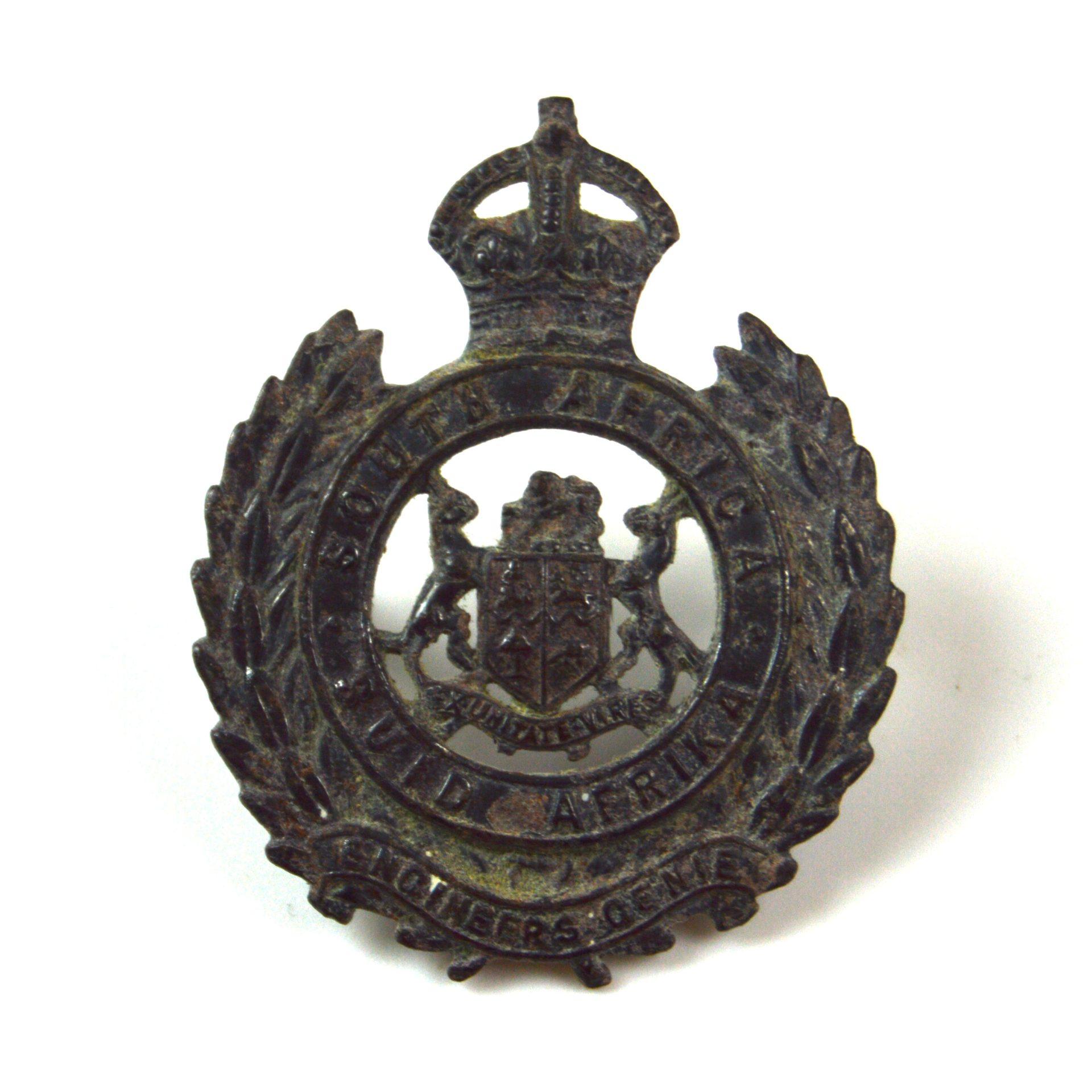 An original World War II era cap badge of the South African Engineers Corps (WWII Pattern) Steel. Of interest to the South African badge collector.