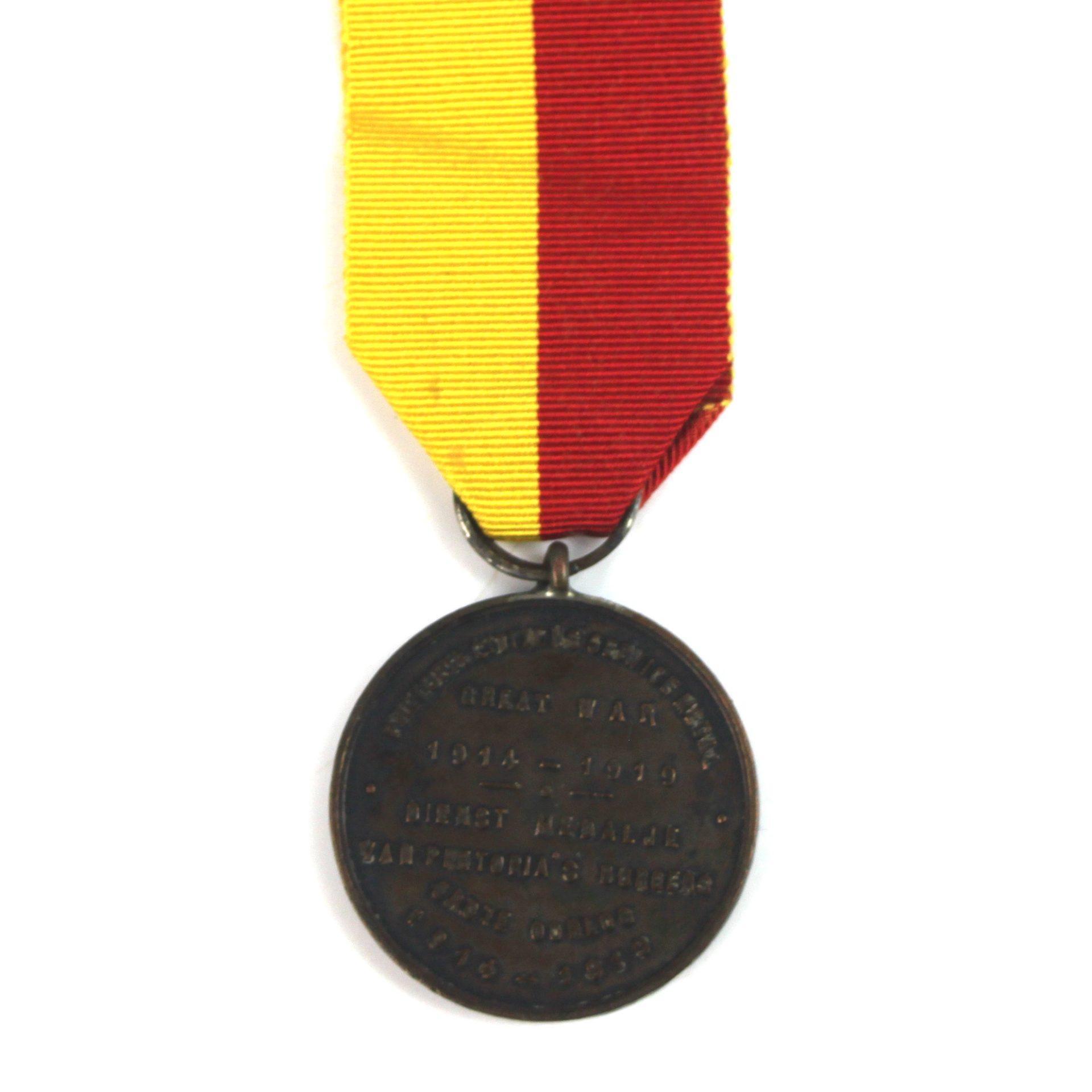 South African Pretoria Citizen’s Service 1914-1919 Medal. Bronze medal that features the coat of arms of Pretoria on the obverse and “PRETORIA CITIZEN’S SERVICE MEDAL, GREAT WAR, 1914 – 1919, DIENST MEDALJE, VAN PRETORIA’S BURGERS, GROTE OORLOG, 1914 – 1919”
