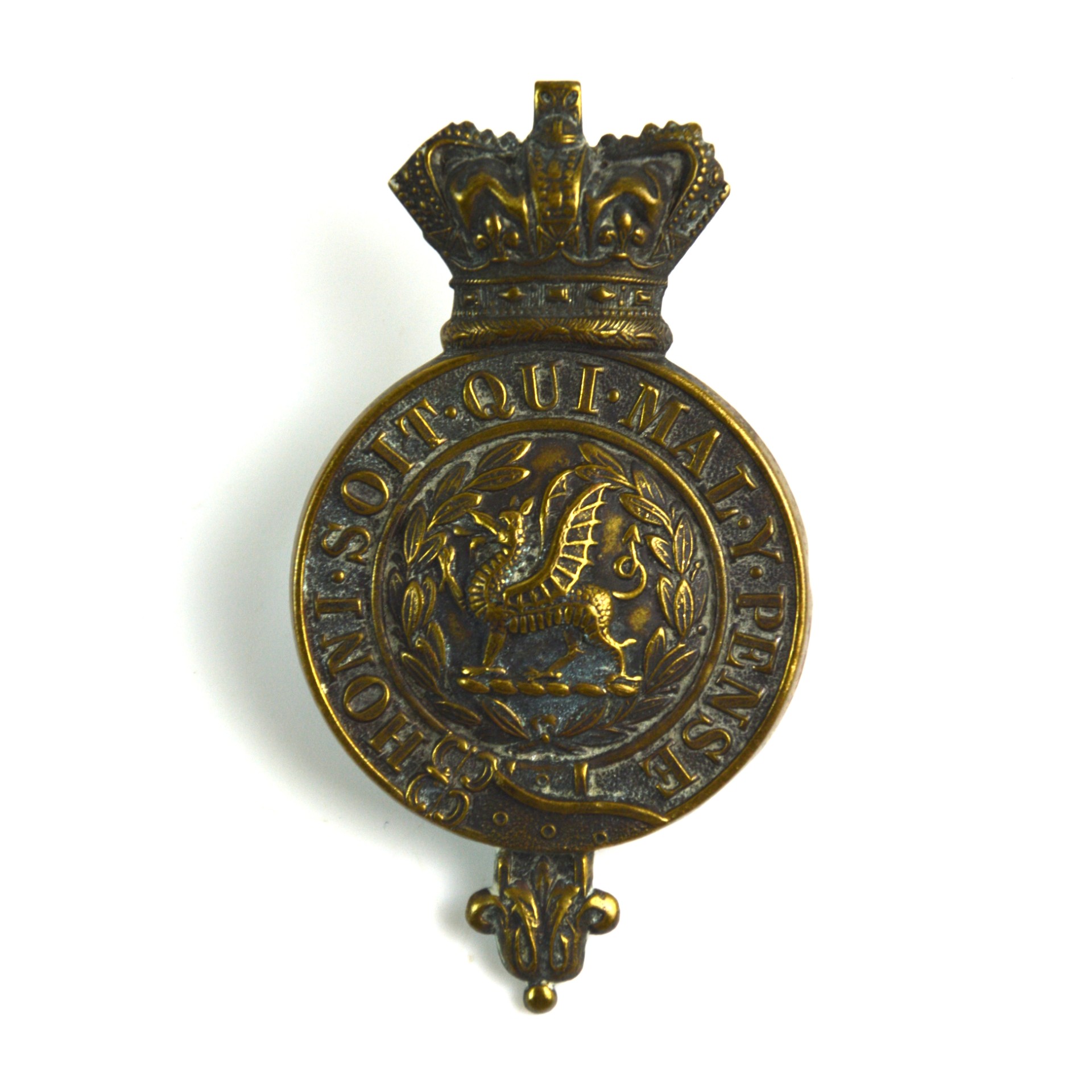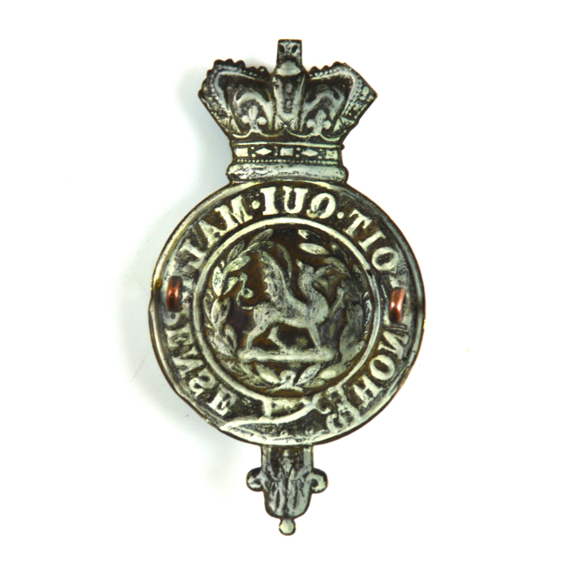 Very good, retaining a crisp appearance with well-defined relief. The metal surface has a dark patina with minor handling wear only. Reverse fittings are complete and secure, with no visible repairs or alterations. This is a presentable South Wales Borderers reproduction glengarry badge, ideal for display, reference collections, reenactment use, or as a representative example of the pre-1901 regimental badge design.