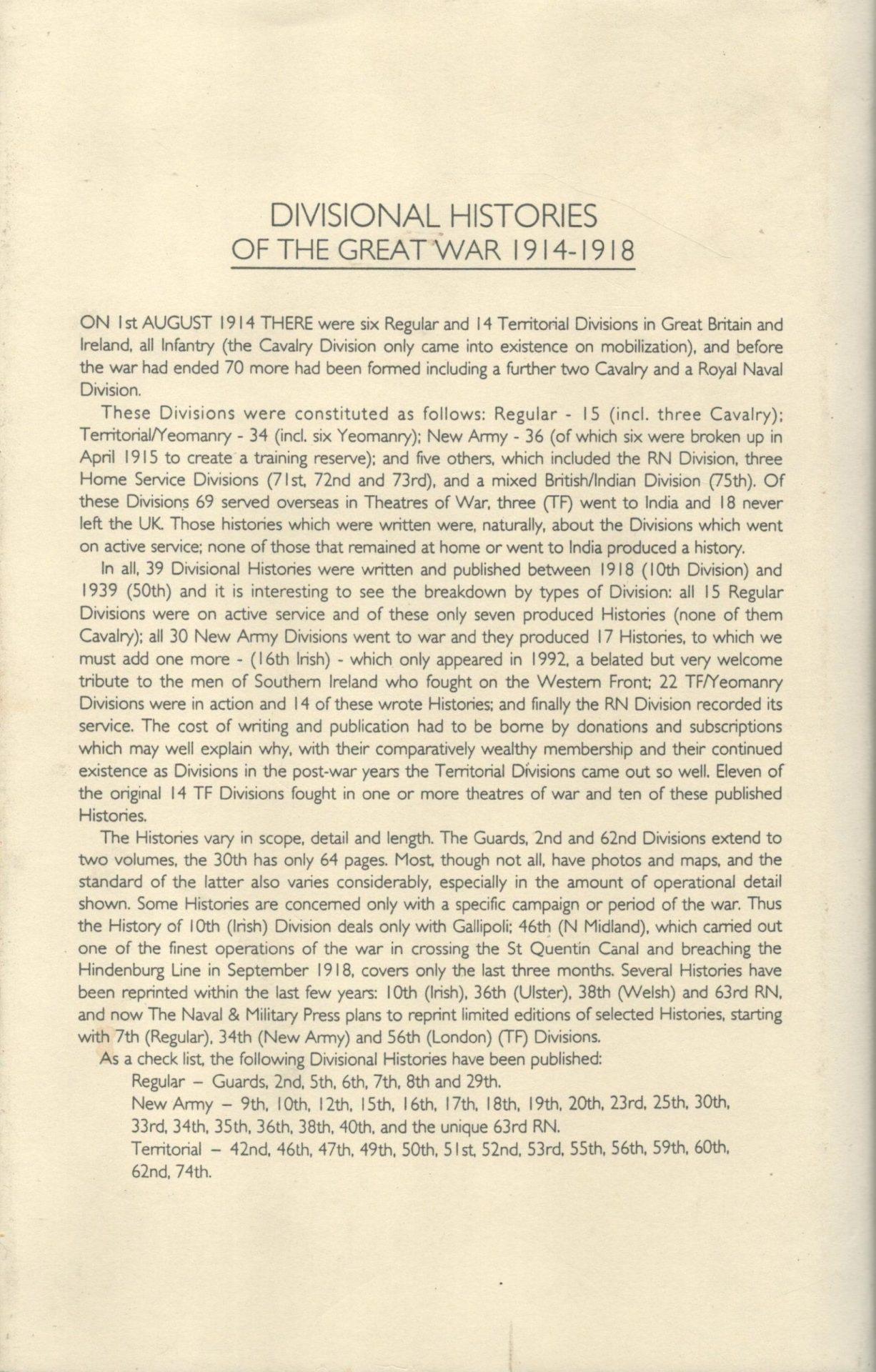 Dust jacket shows shop wear including some discolouration and rubbing. Maroon boards with slight shop wear to bottom edge, otherwise as new. Block clean and tight with slight dust staining to top edge. Originally published in 1921. Illustrated with 7 photographs and 15 maps. The author of this history commanded the 18th Battalion Northumberland Fusiliers, the divisional pioneer battalion. It is a good read and the details of the actions are supported by excellent maps. This division had the melancholy distinction of suffering the highest casualties of any of the assaulting divisions on the opening day of the Somme, 1 July 1916 – 6,380 of whom 2,480 were killed. Unusually it had only two commanders throughout the war; the first, Ingouville-Williams (‘Inky Bill’), was killed near Mametz on 22 July 1916. Casualty figures are given for the various periods spent in the line, with annual summaries. Reinforcements, reorganisations, staff and command changes, individual achievements in action are all covered. Finally, a table summarises the 2,506 honours and awards and the 364 foreign awards won by the officers and men of the division.