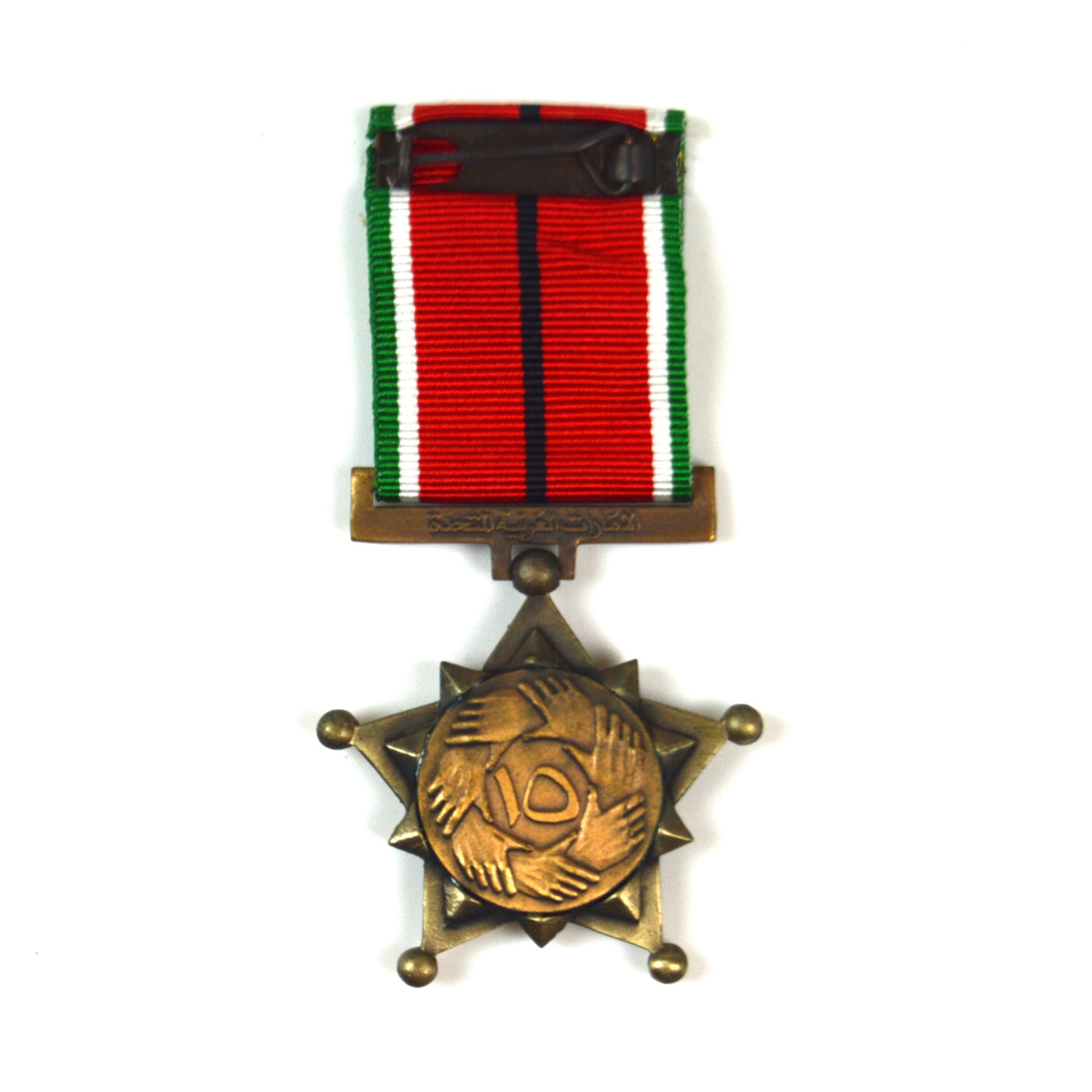 Struck in bronze, the medal features the national emblem of the UAE on the obverse — a falcon with a ship in a wreath in the centre — along with an inscription in Arabic below. The reverse bears a ring of interlocking hands with “15” in Arabic numerals. The medal is suspended from a ribbon in the national colours of red, green, white, and black.