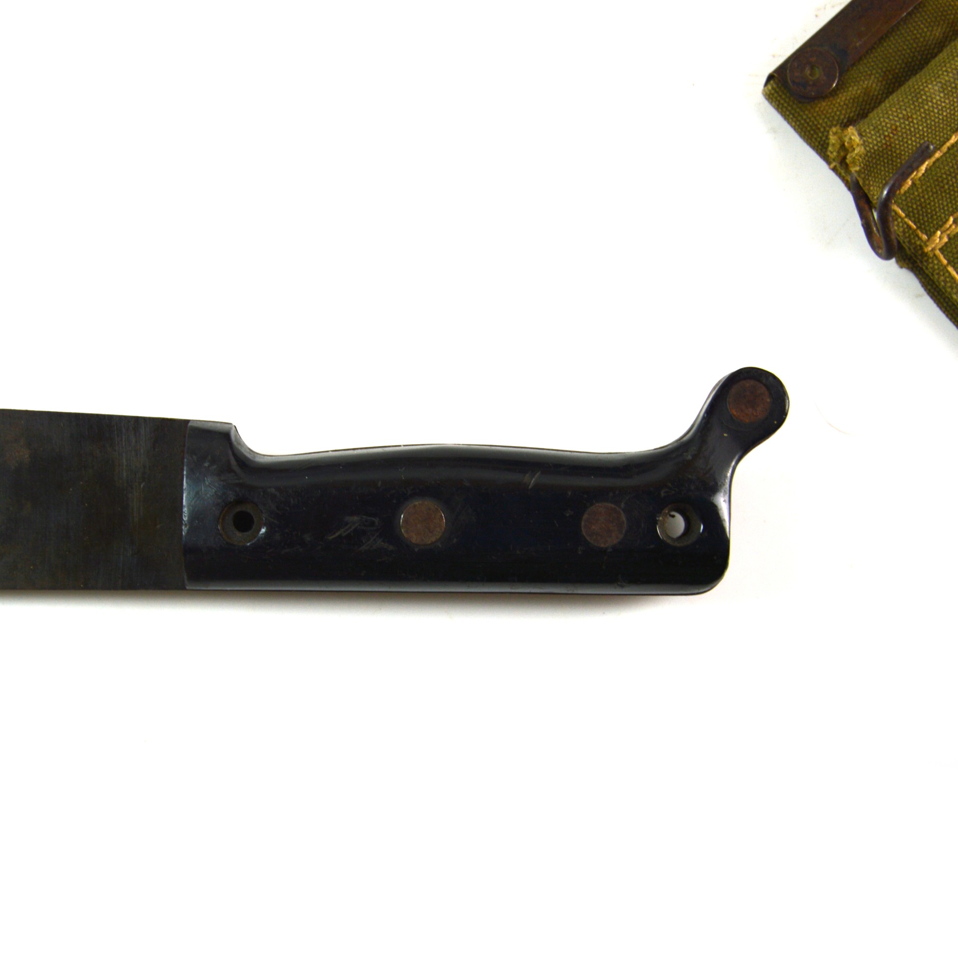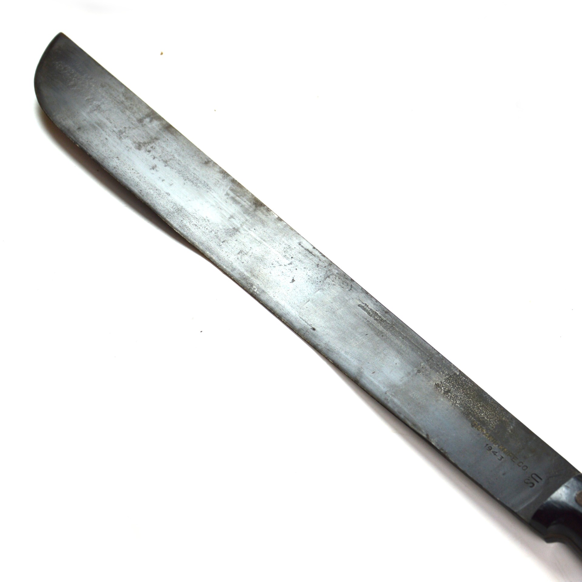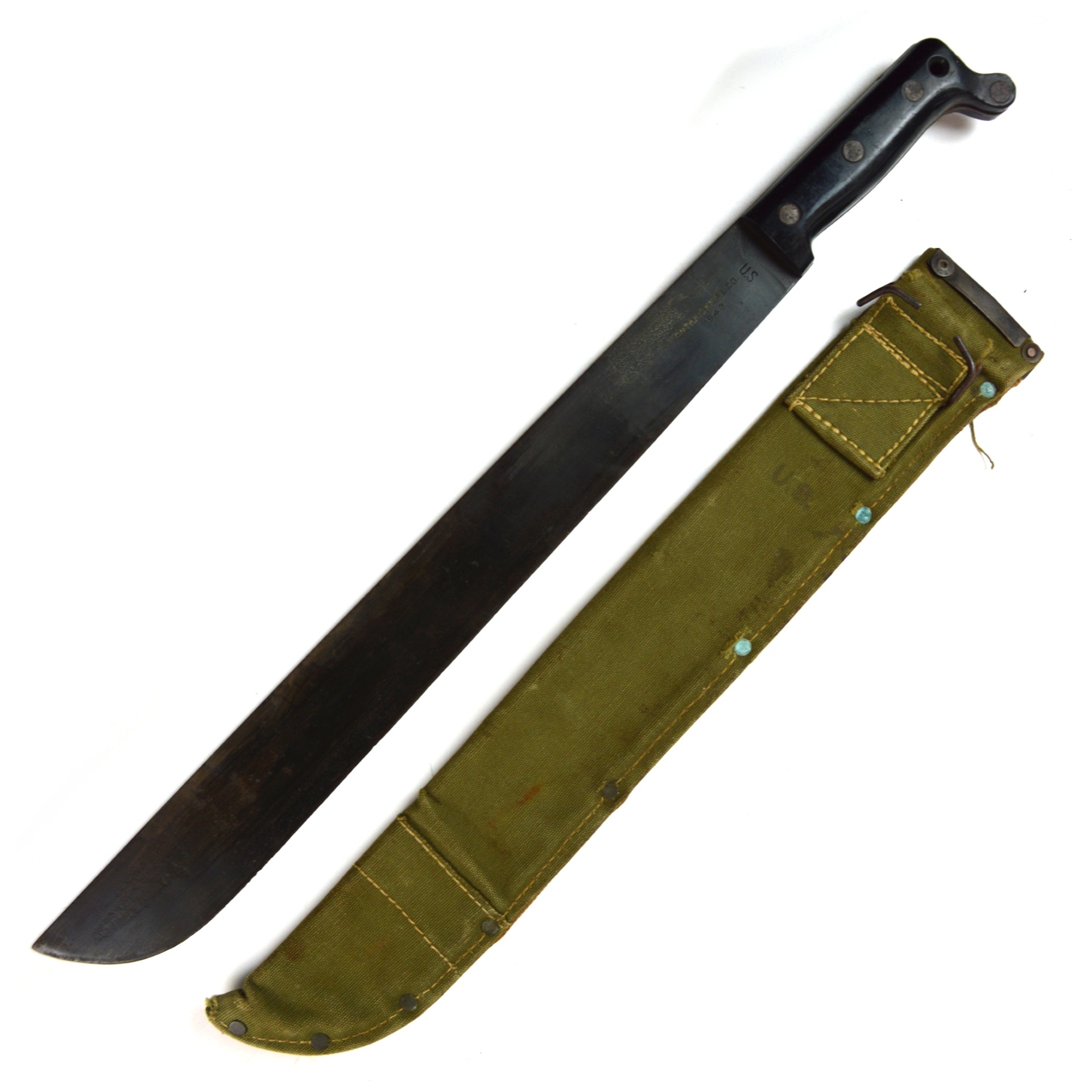 Good. Machete remains in good, service-used condition. The blade shows light pitting and surface wear, with a clear manufacturer’s stamp and 1943 date. The edge retains its original profile with little evidence of use. The grips are solid and secure with minor handling wear; however, the cap of one of the rivets is absent.