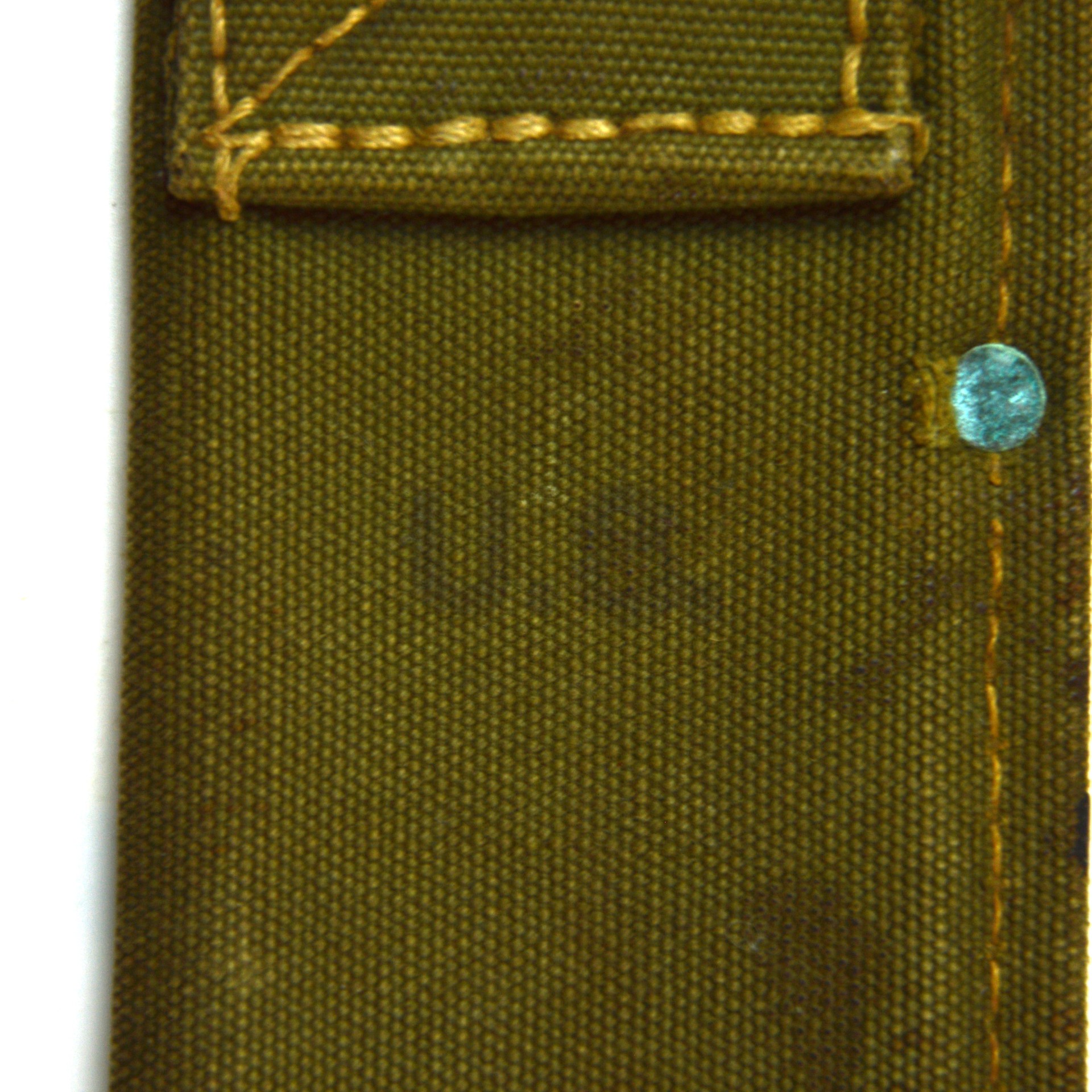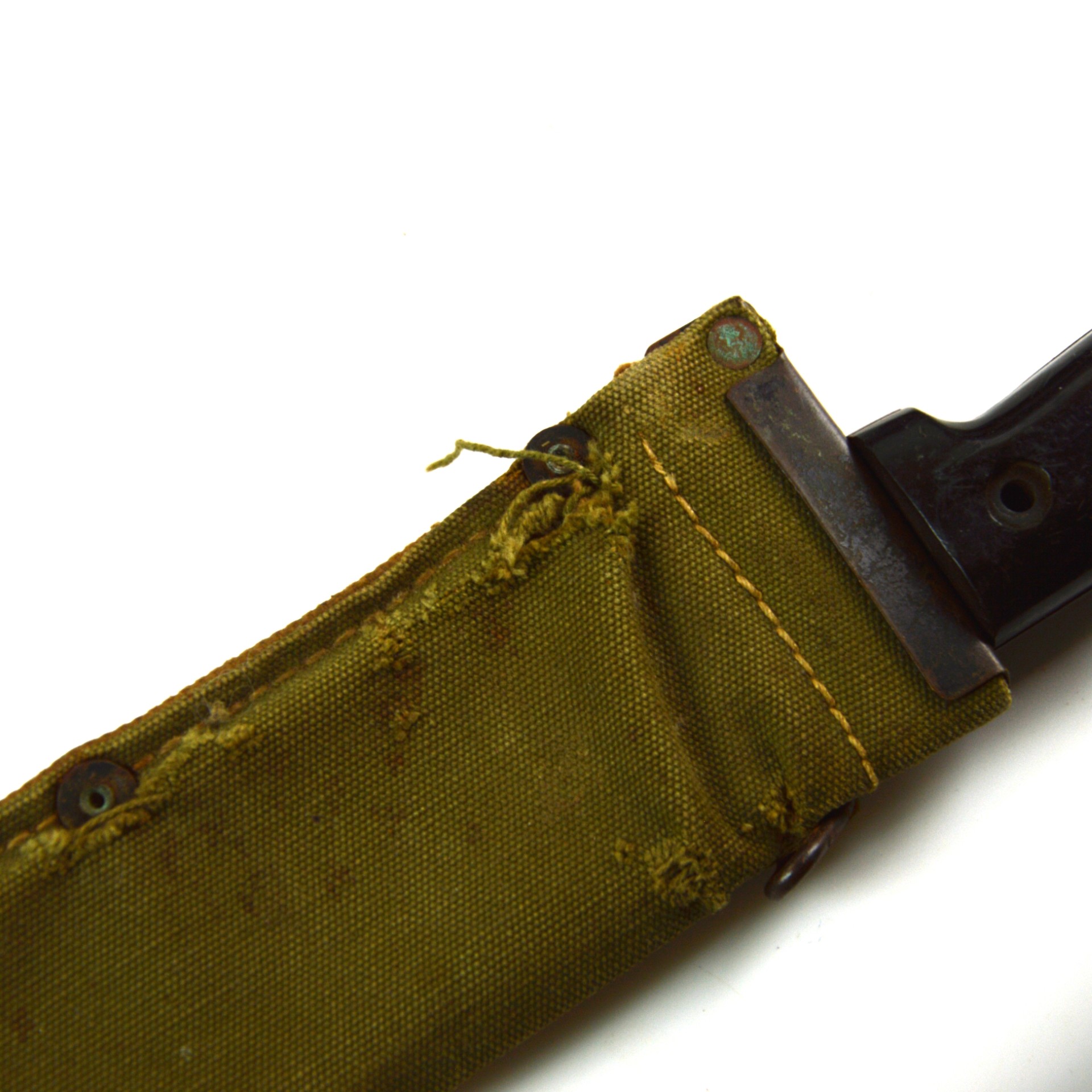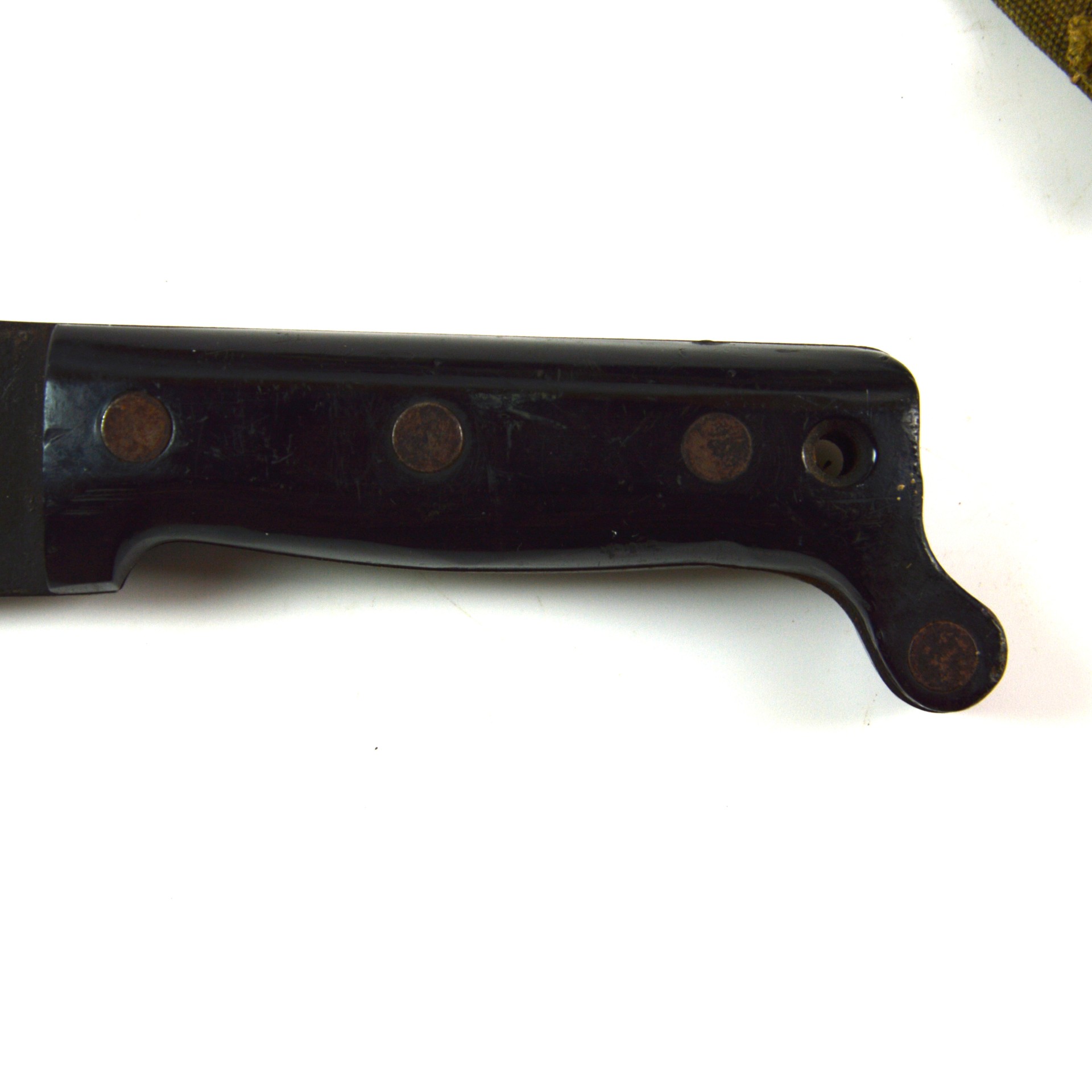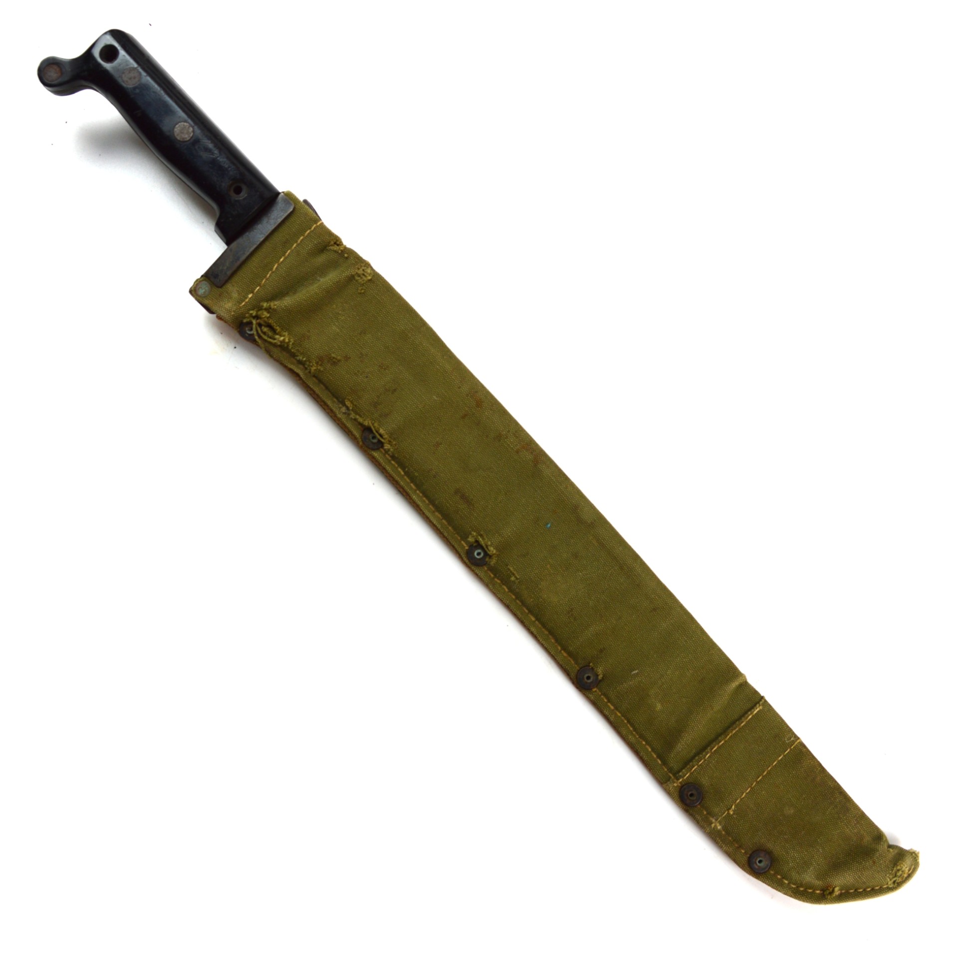 Good. Machete remains in good, service-used condition. The blade shows light pitting and surface wear, with a clear manufacturer’s stamp and 1943 date. The edge retains its original profile with little evidence of use. The grips are solid and secure with minor handling wear; however, the cap of one of the rivets is absent.