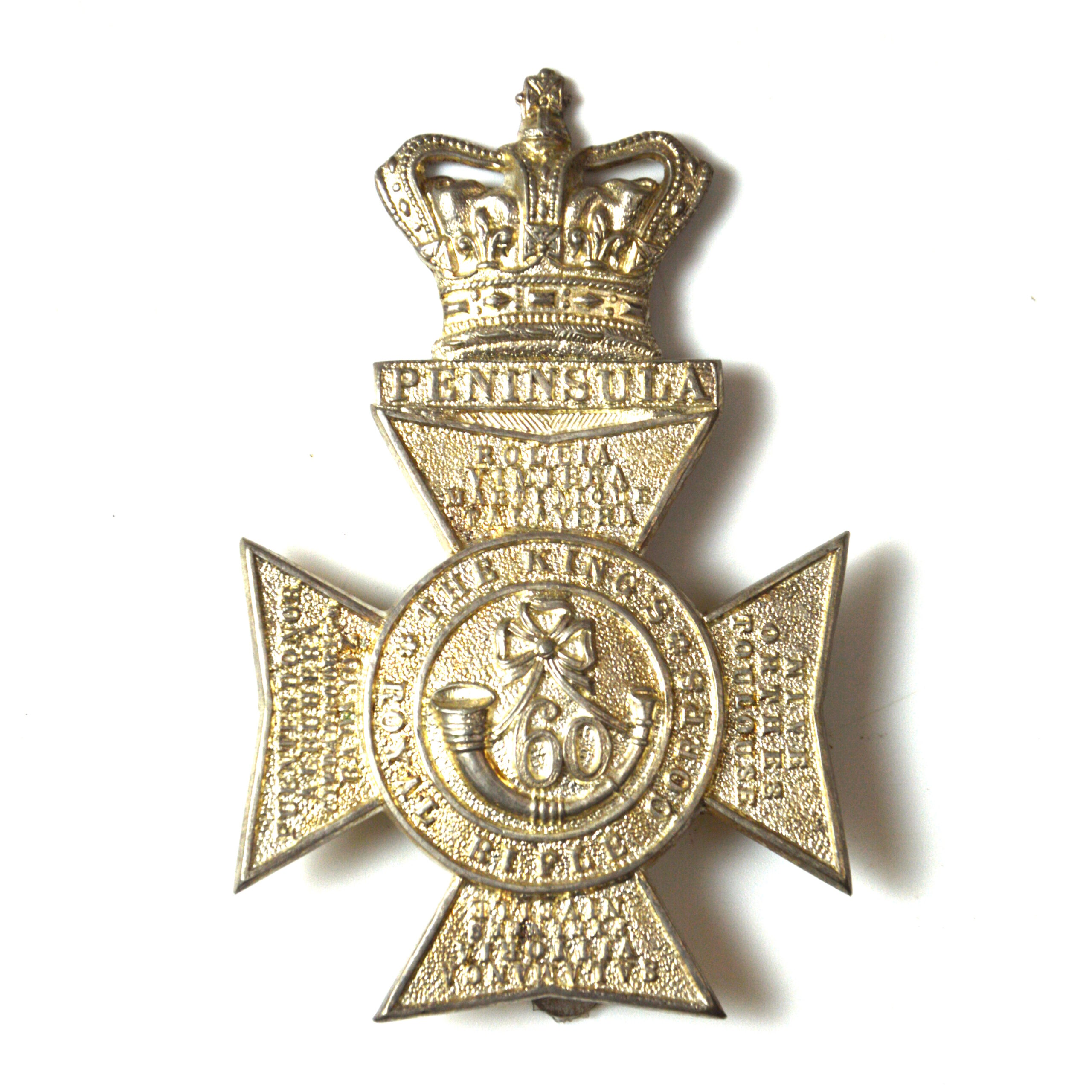 60th King’s Royal Rifle Corps (KRRC) Officers’ silver-plated helmet plate, later converted for wear as a pugri badge, a distinctive example of British Army light infantry insignia. This badge is associated with the King’s Royal Rifle Corps, one of the army’s historic rifle regiments, known for its specialised role in skirmishing and marksmanship.