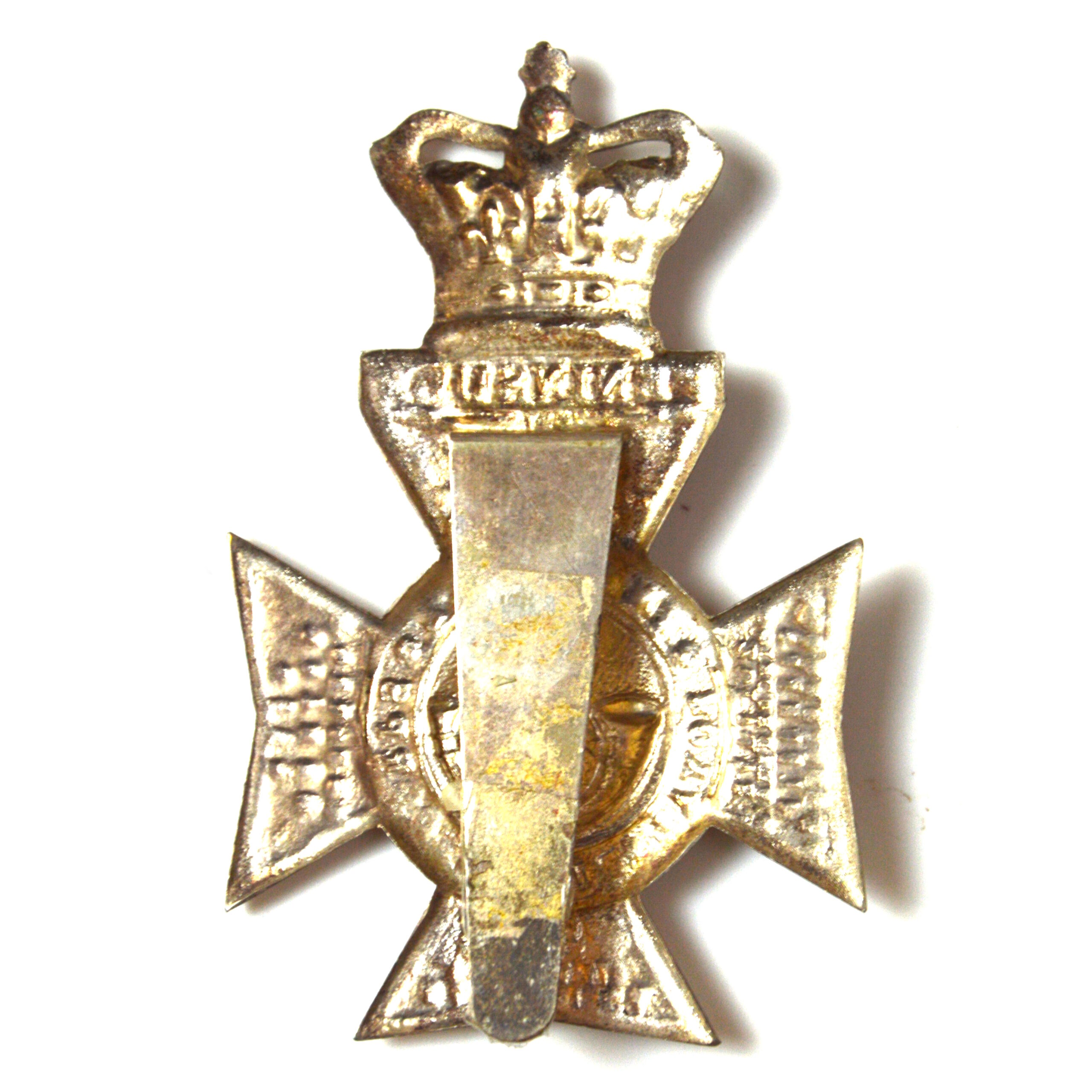 The helmet plate features the regiment’s characteristic design in relief, often incorporating a Maltese cross motif with a central bugle horn device surmounted by Queen Victoria’s crown and surrounded by battle honours on the arms of the cross and a circlet bearing the regimental title “King’s Royal Rifle Corps”.