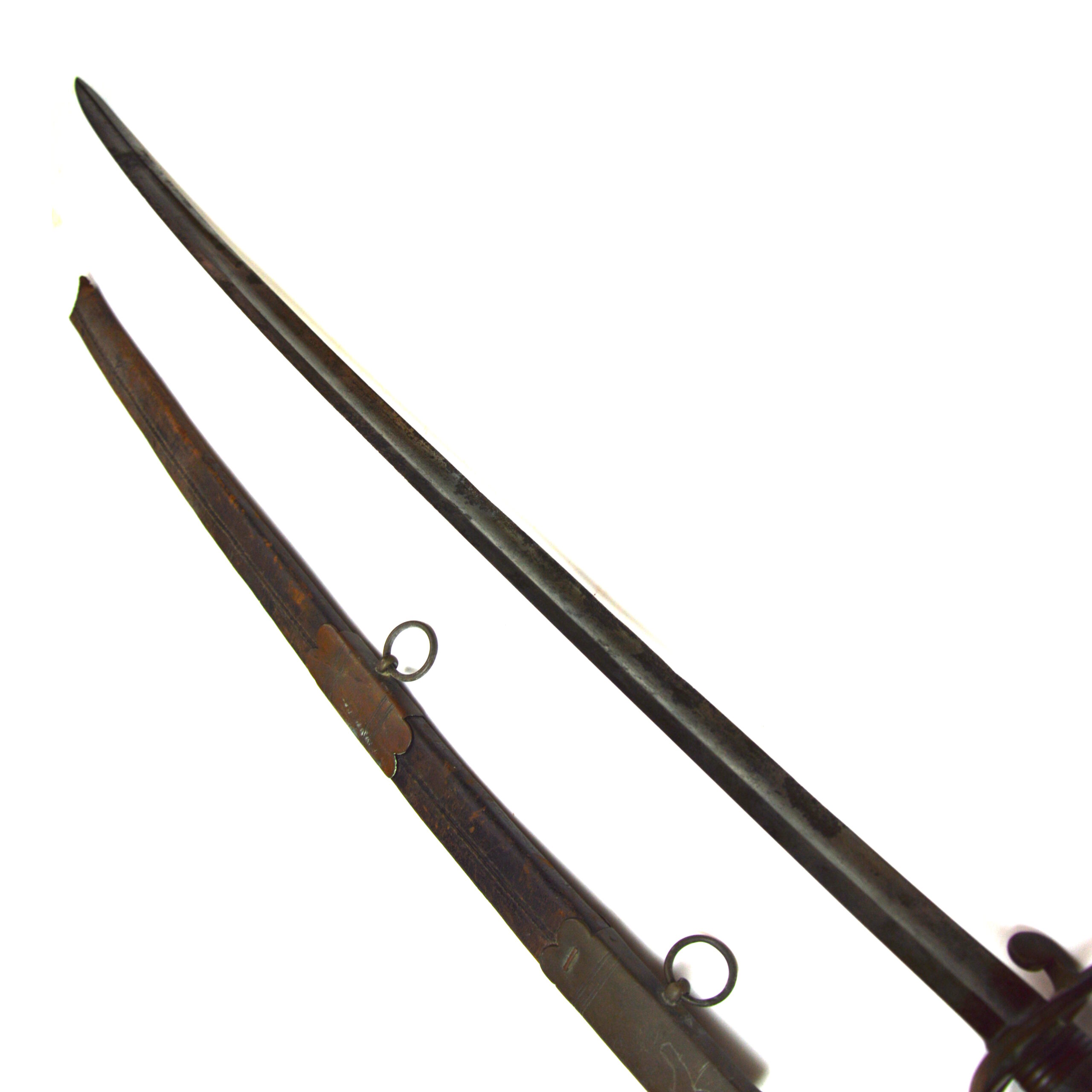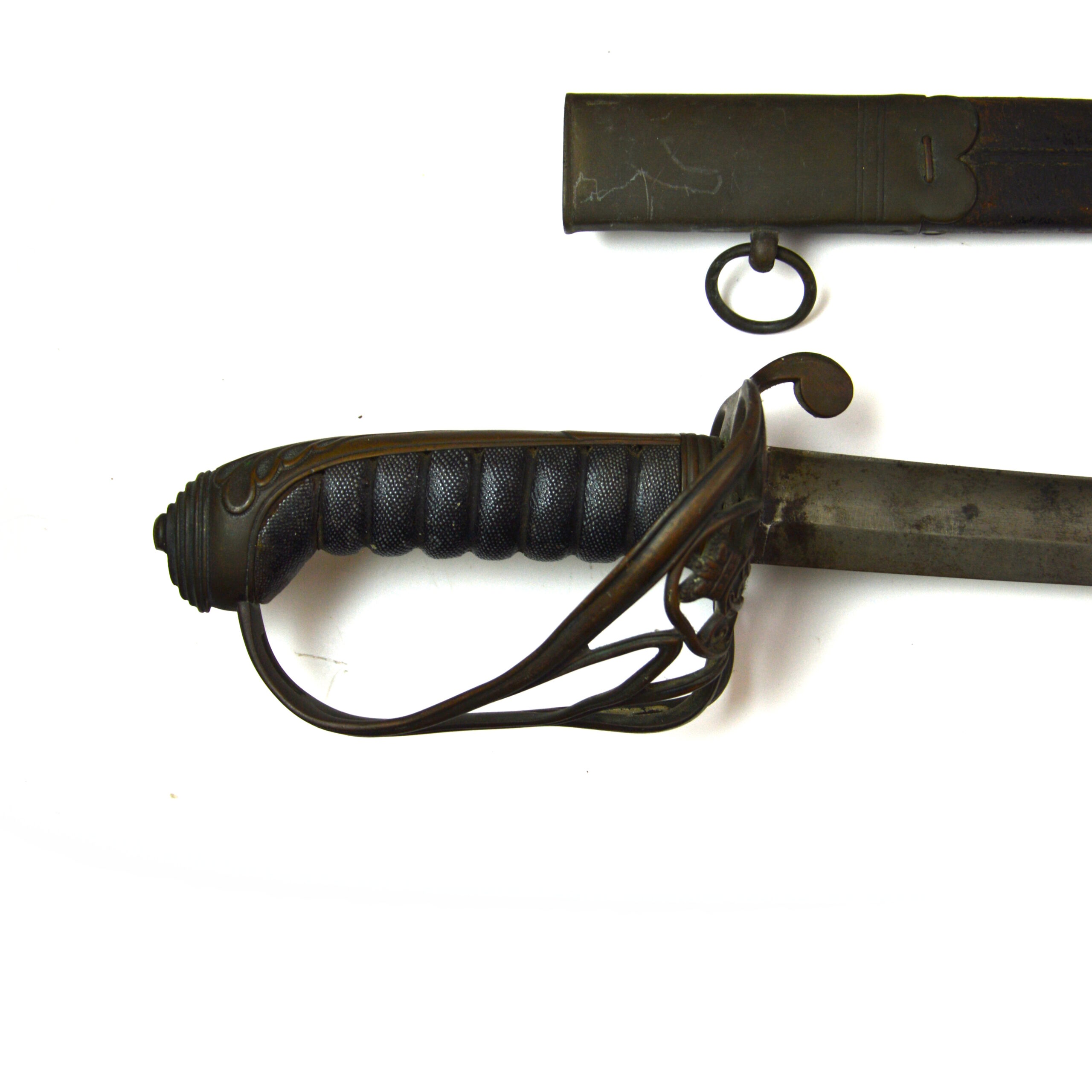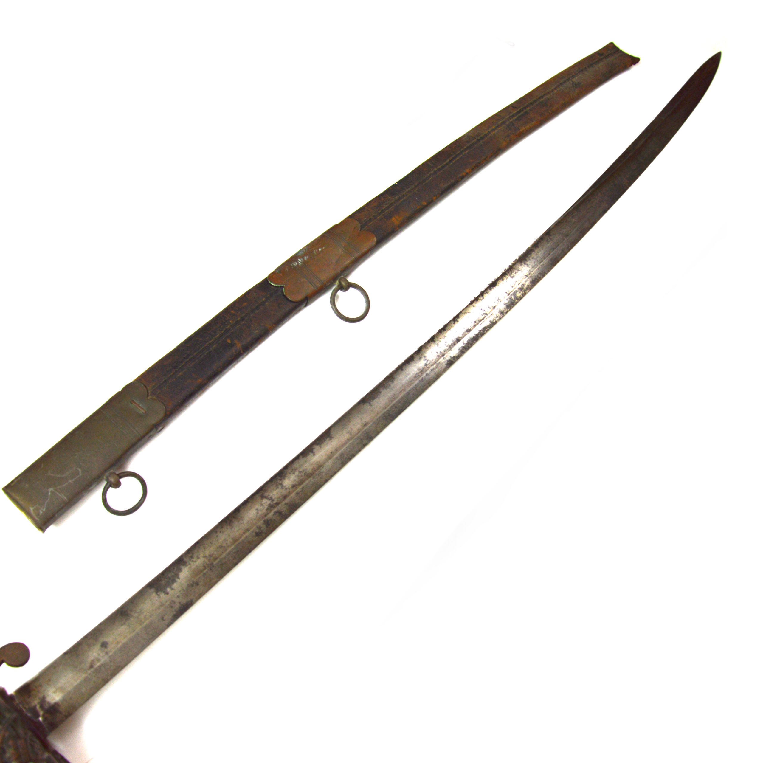 Poor condition, with noticeable pitting on the blade and distortion to the handguard hilt as well as lacking the binding on the shagreen grips. Other expected age-related wear, surface marks, and signs of service use are present. The scabbard is broken off towards where the chape would’ve been, with expected wear consistent with age.