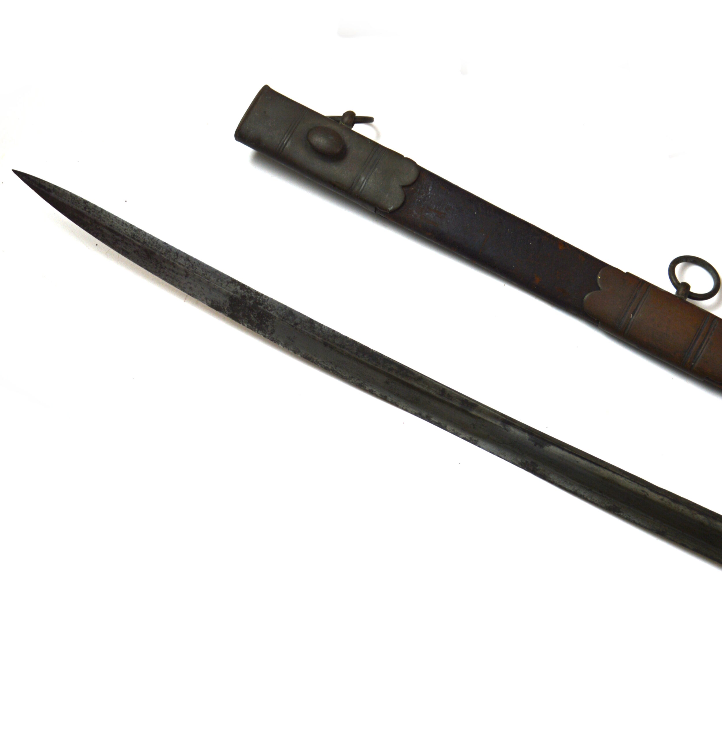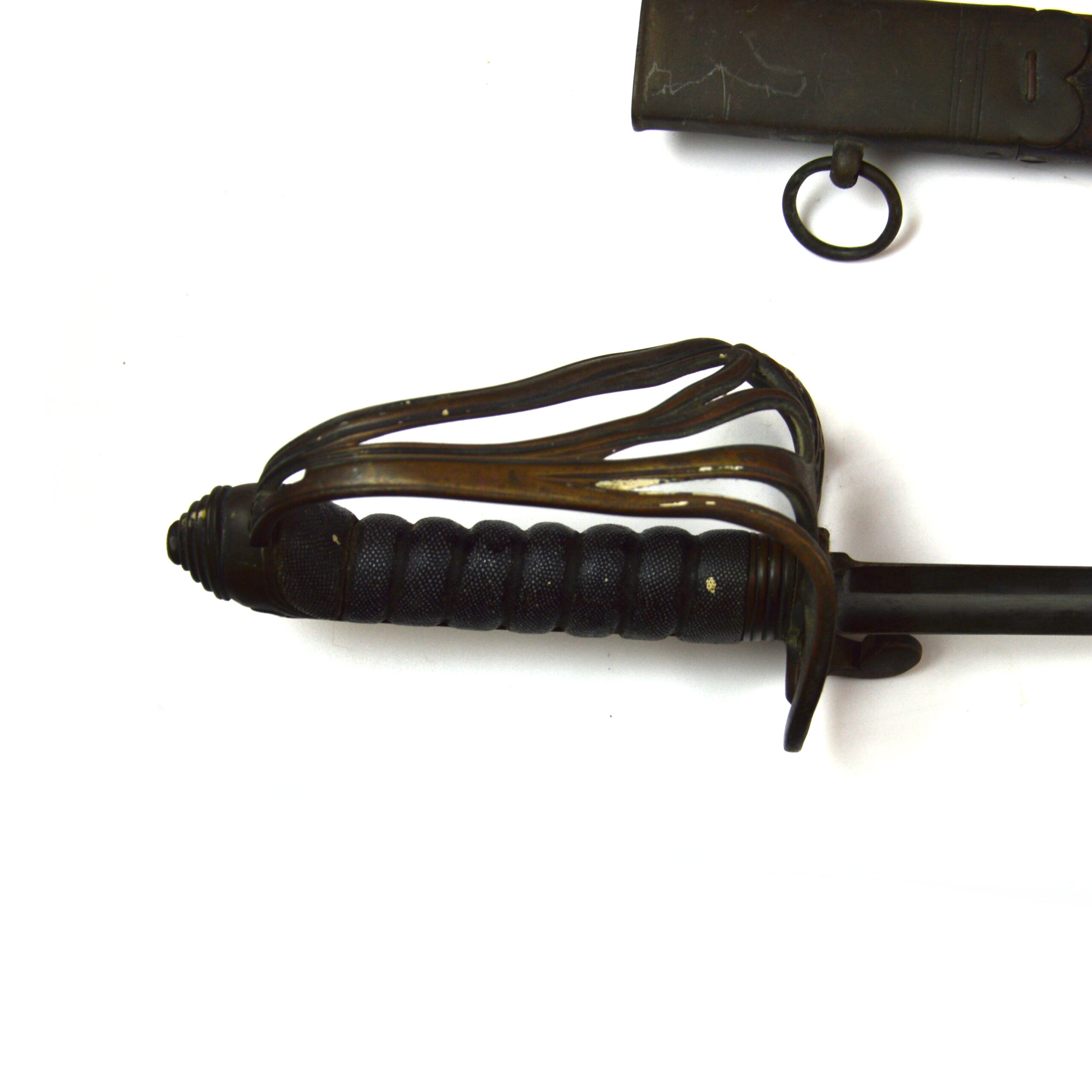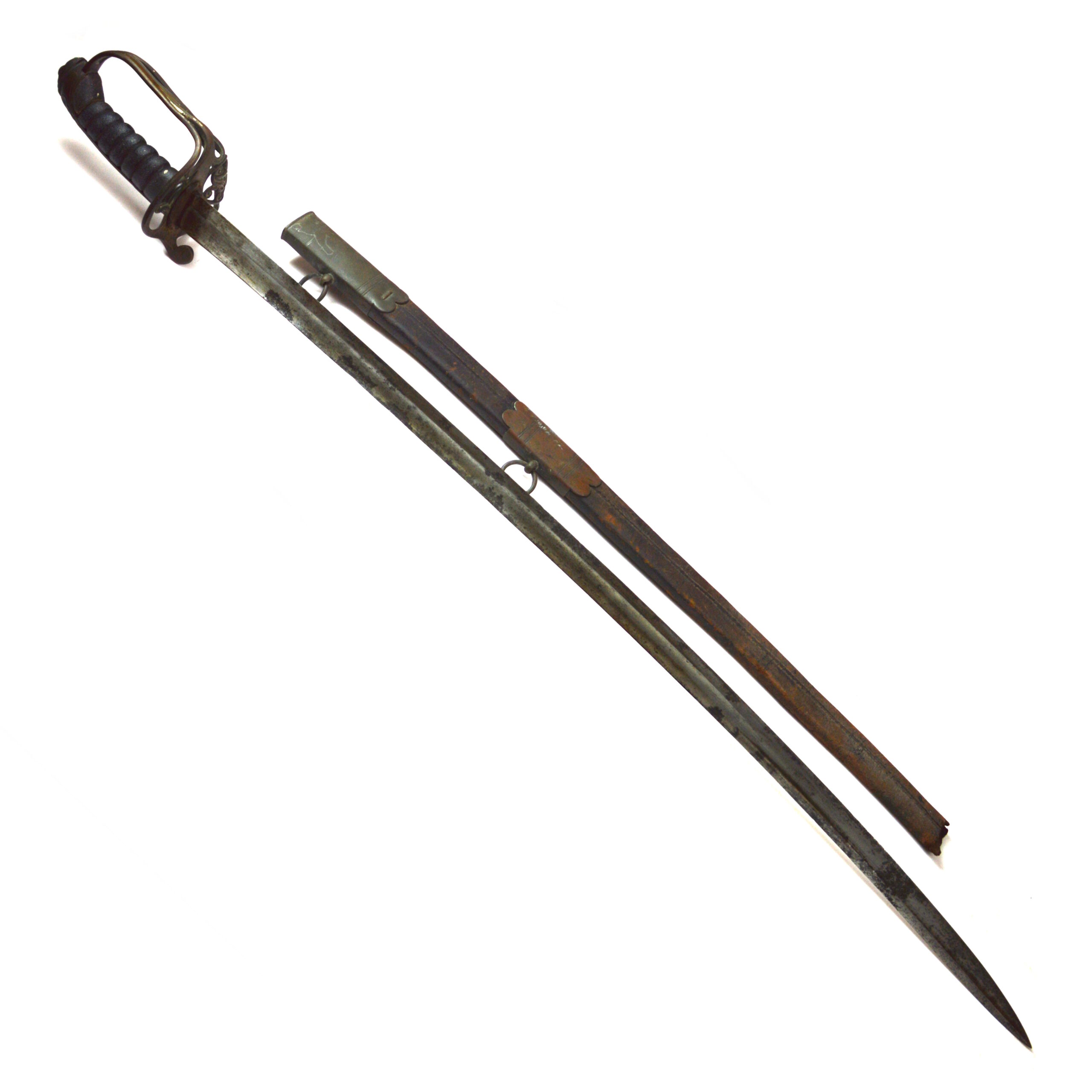 Poor condition, with noticeable pitting on the blade and distortion to the handguard hilt as well as lacking the binding on the shagreen grips. Other expected age-related wear, surface marks, and signs of service use are present. The scabbard is broken off towards where the chape would’ve been, with expected wear consistent with age.