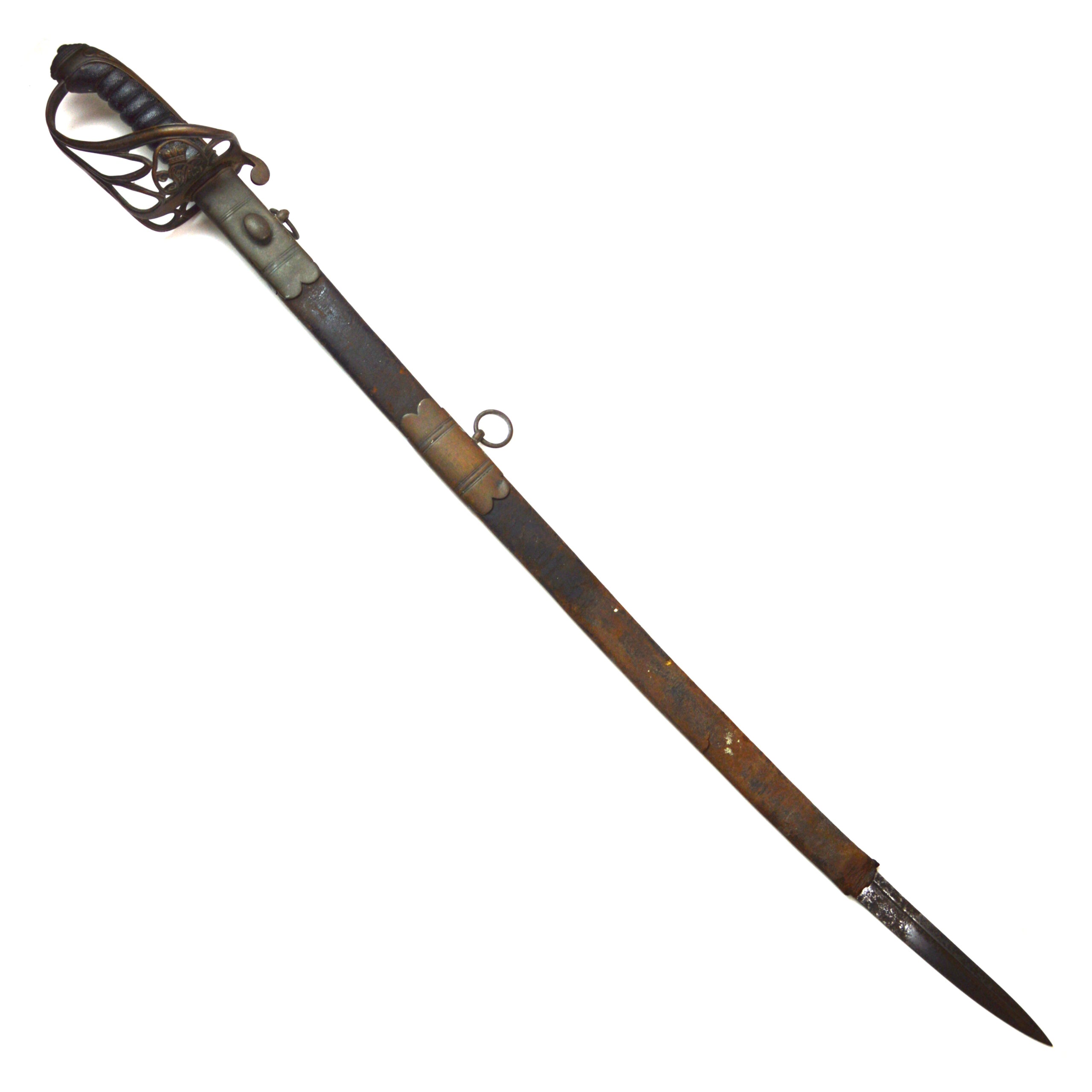 This example retains its accompanying scabbard of leather construction with brass mounts, providing both protection for the blade and completeness for display. As a matched set, it offers an authentic representation of an officer’s service sword from the Victorian period.