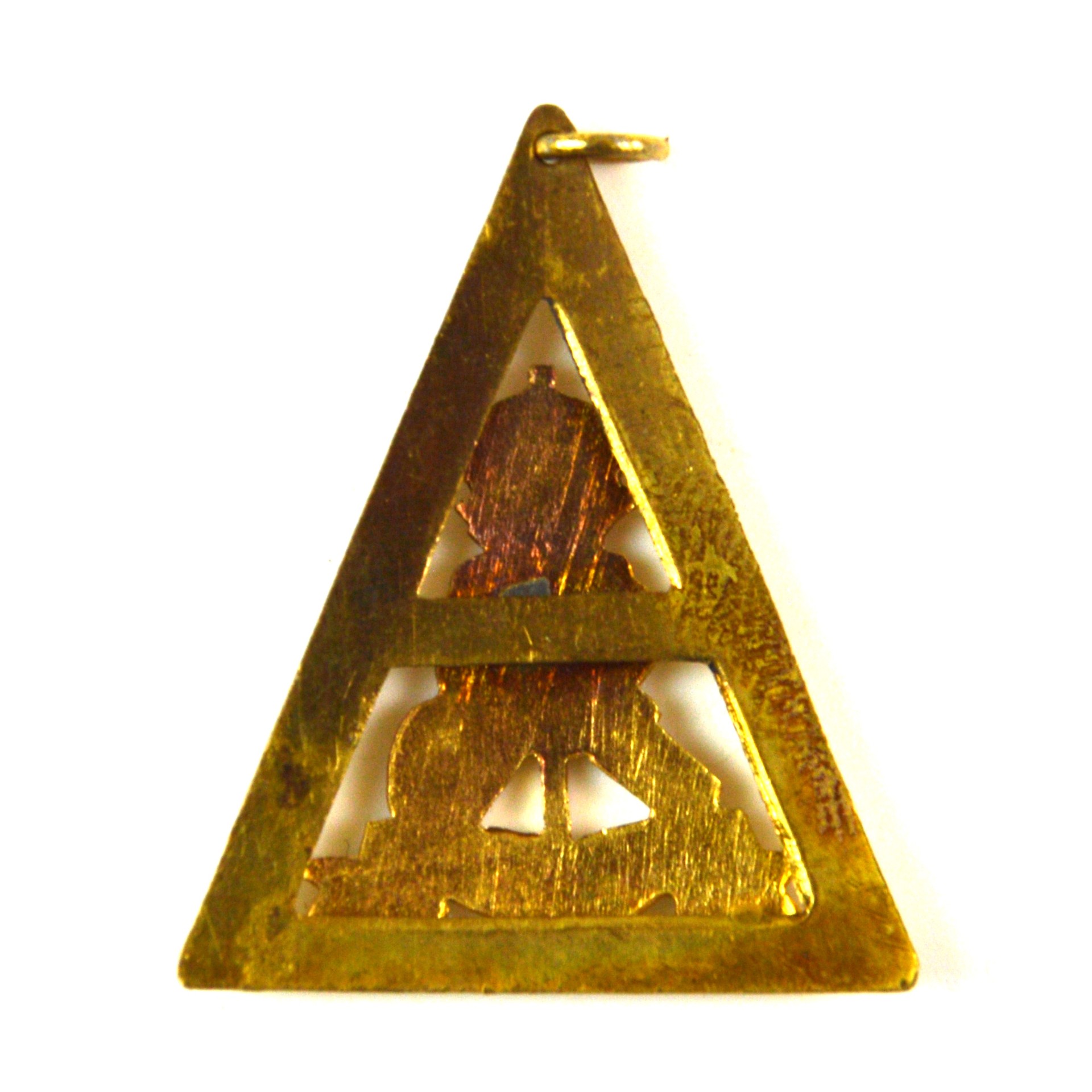 WW2-Era Pioneer Corps Gilt and Enamel Pendant, displaying the 1st pattern Pioneer Corps cap badge design on a triangular-shaped background, all executed in gilt and detailed in blue and red enamel. Suspended from a ring suspender